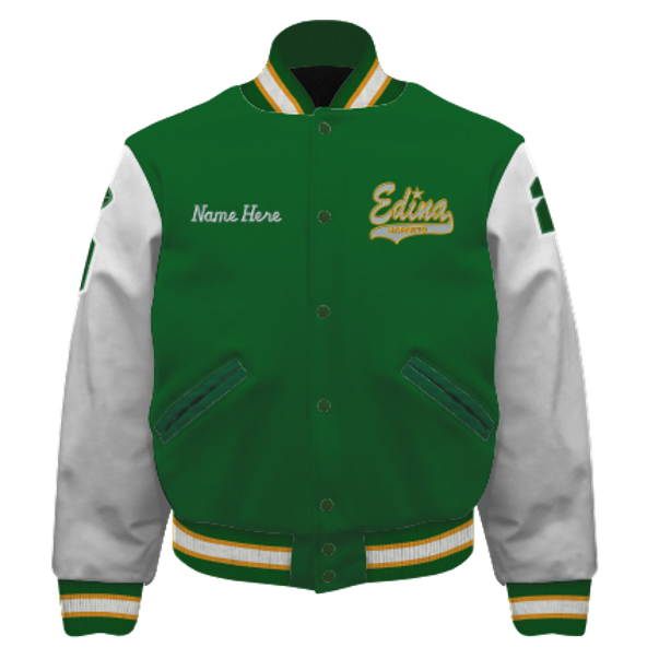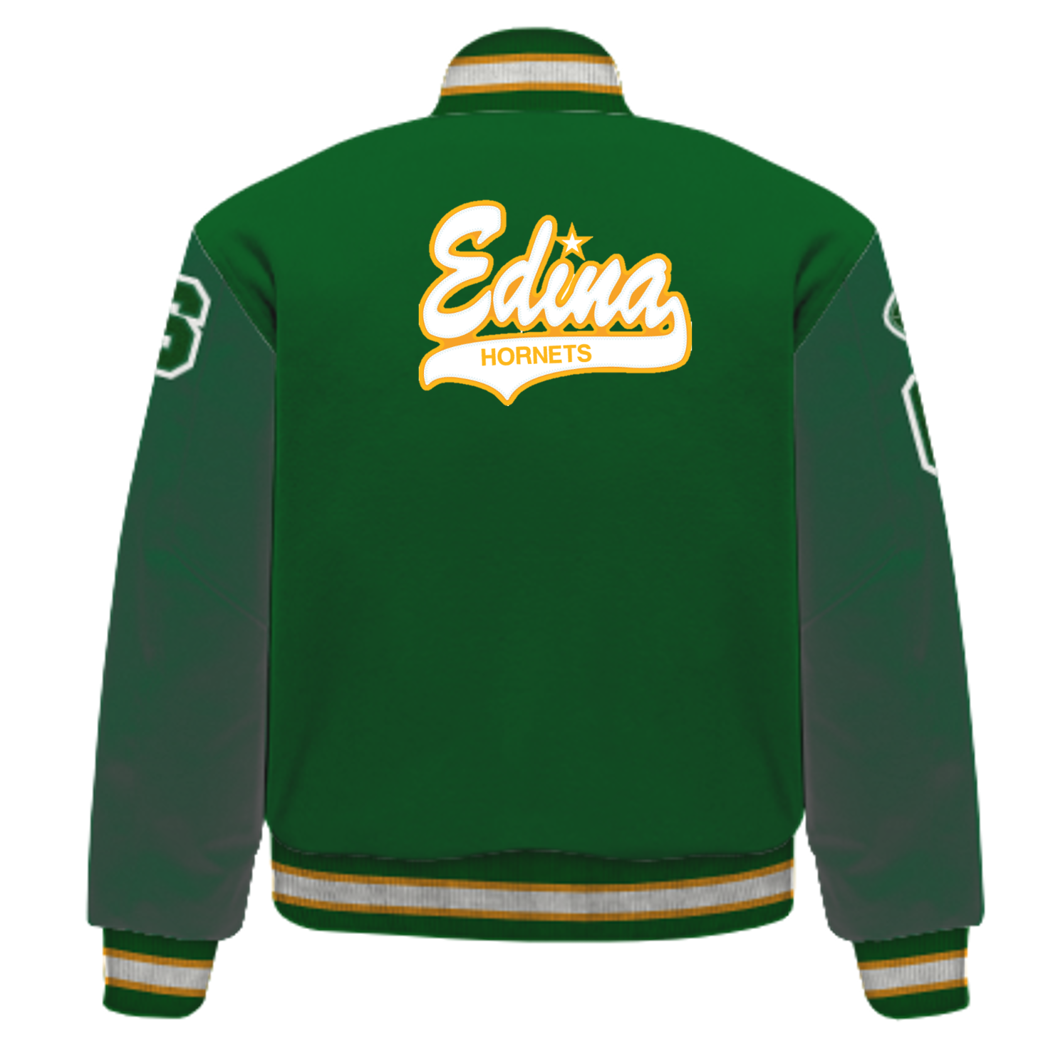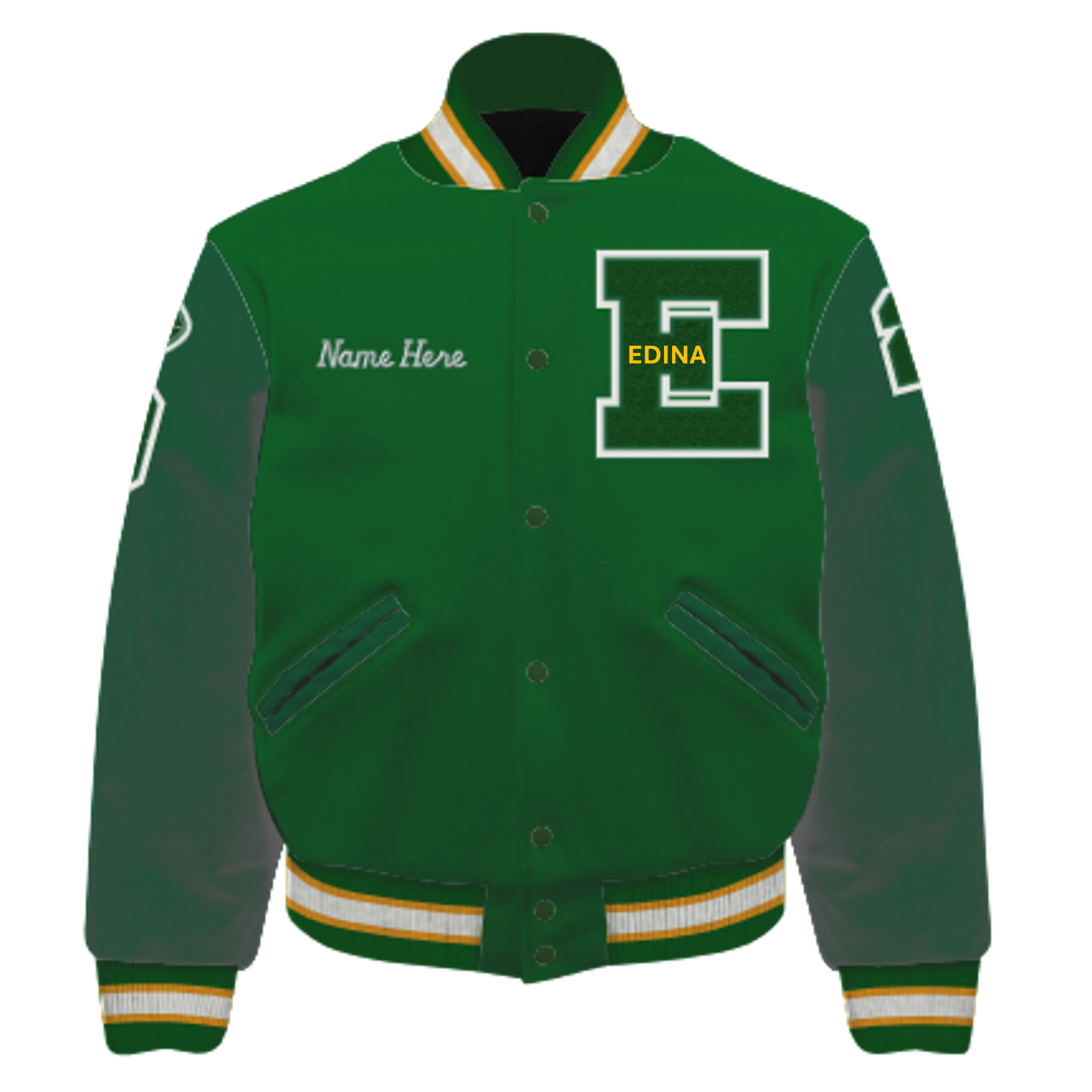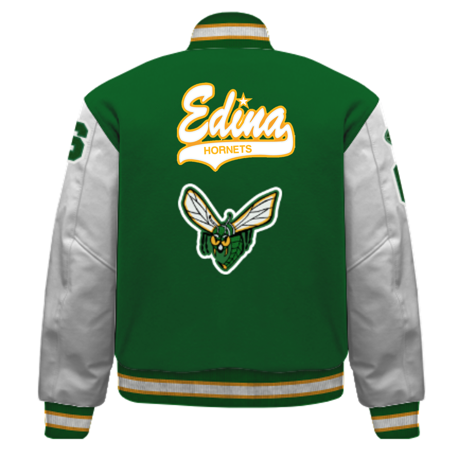 Edina Athletics & Activities has been working to update the EHS letterman jacket offering to include all of the options that showcase Edina and Hornet pride! Choose from two jacket designs: white or green sleeves. Add the custom Edina elements that make the jacket yours - Edina front logo, E with Edina chenille letter, Edina logo on back in tackle twill and/or the custom chenille Hornet. Add your grad year and activities and more!