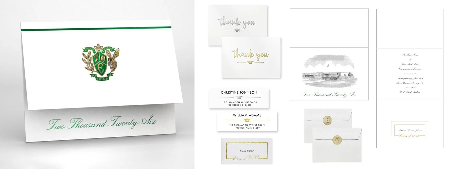 The 2026 Edina High School Graduation Announcement features the Edina HS crest and 2026 year date in fine gold and green foil details. This tri-fold design opens up to feature the school building etching and when fully opened details the graduation commencement details along with pre-cut slots for a name card. Name cards customize the announcement to the student. Name cards are not included but can be purchased separately. Complete your senior stationery with grad themed envelope seals, return address labels and thank you cards.