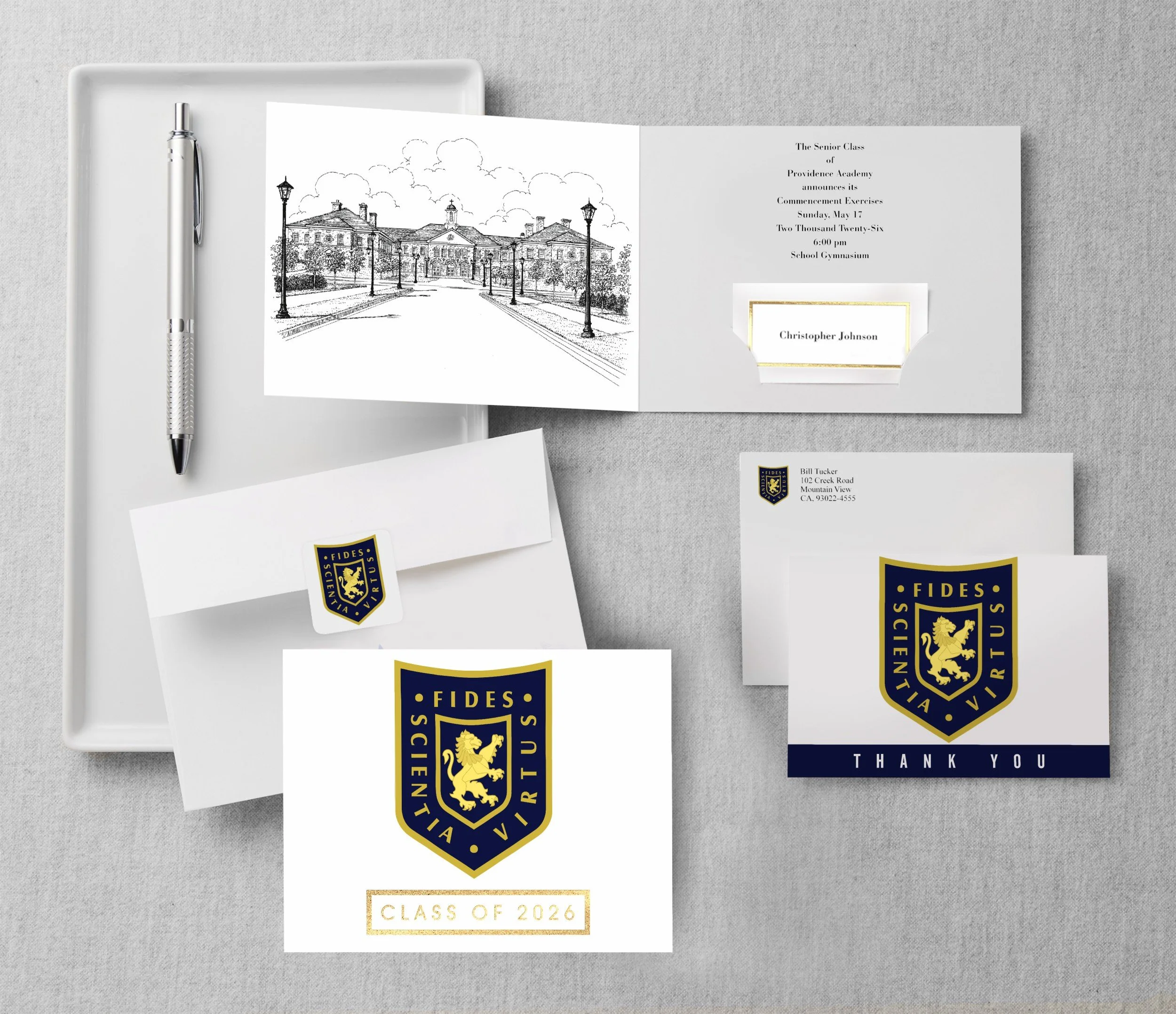 The 2026 Providence Academy Graduation Announcement & stationery features the Providence Academy crest. Inside, details include the building etching and commencement details, along with pre-cut slots for a name card. Name cards customize the announcement to the student. Complete your graduation stationery with custom envelope seals, return address labels and thank you cards.