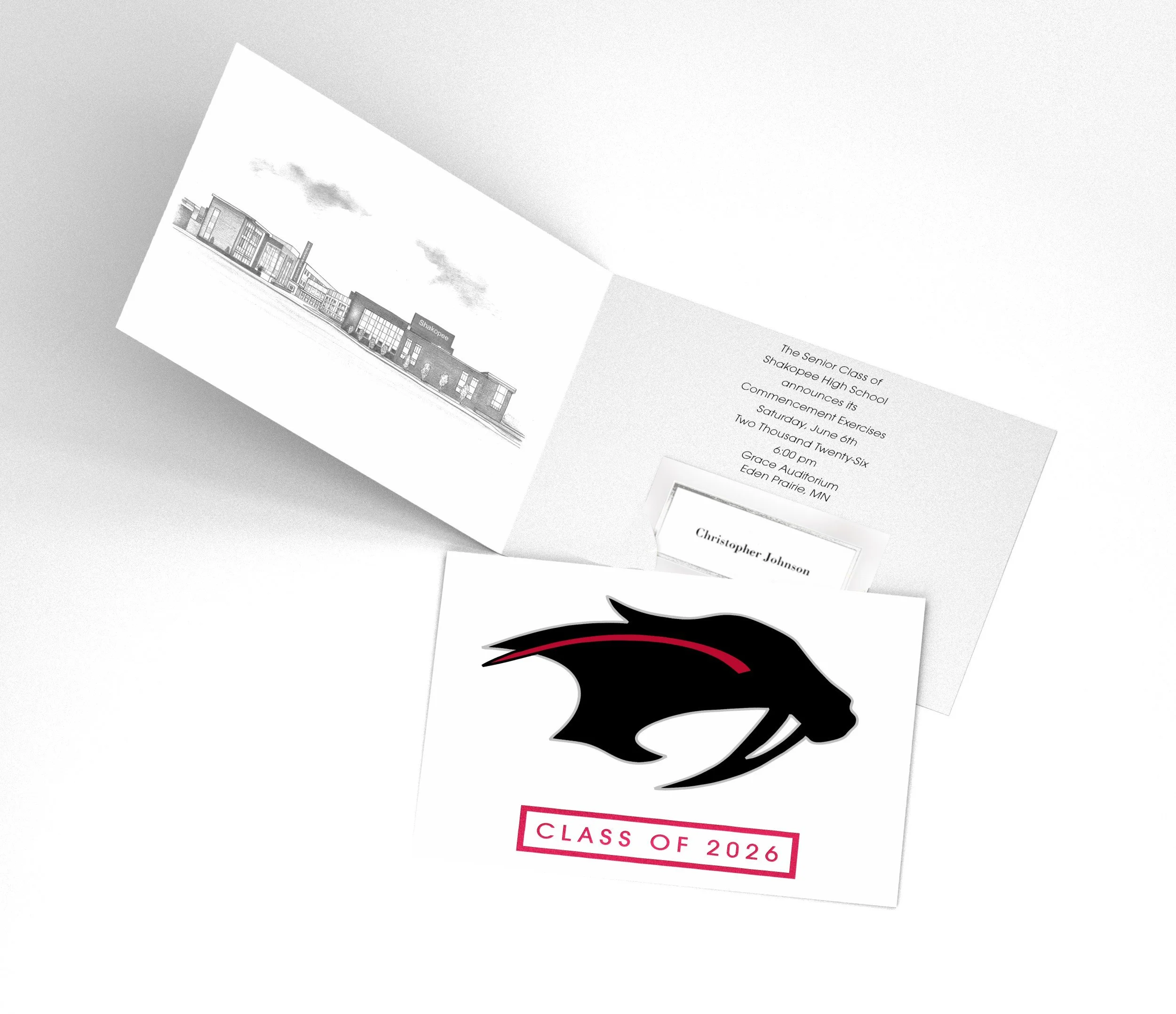 The 2026 Shakopee Graduation Announcement & stationery features the Shakopee Saber. Inside, details include the SHS building etching and commencement details, along with pre-cut slots for a name card. Name cards customize the announcement to the student. Complete your graduation stationery with custom Saber envelope seals, return address labels and thank you cards.