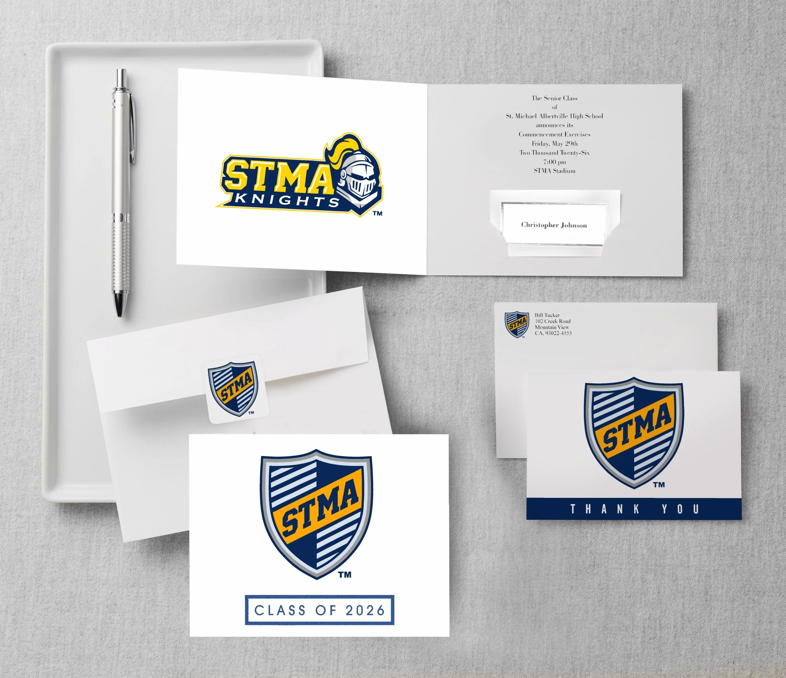 The 2026 STMA Graduation Announcement & stationery features the STMA shield on the cover. Inside, details include the STMA Knight mark and commencement details, along with pre-cut slots for a name card. Name cards customize the announcement to the student. Complete your graduation stationery with custom STMA envelope seals, return address labels and thank you cards.